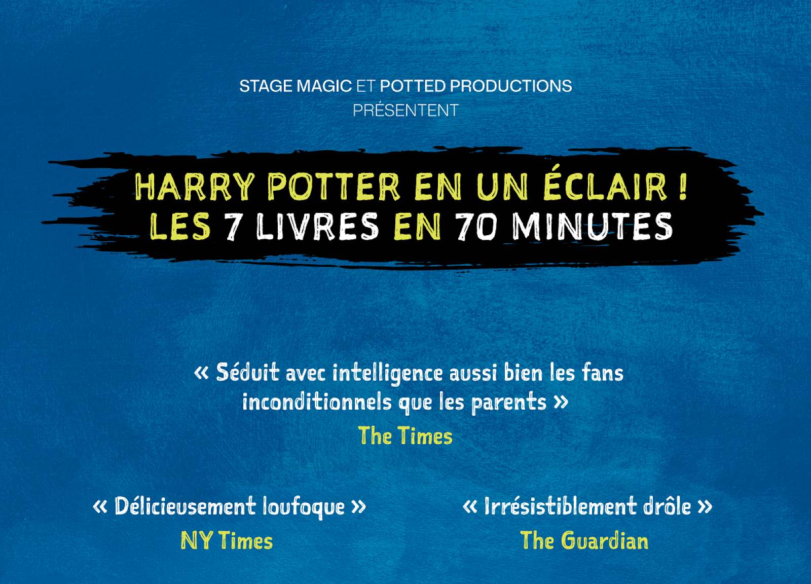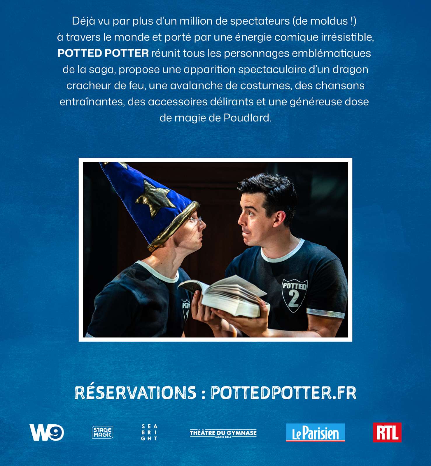 Déjà vu par plus d’un million de spectateurs (de moldus !) à travers le monde (Angleterre, Australie, États-Unis, Canada, Italie, Dubaï, …), le succès international POTTED POTTER se produira en français, en France et en Belgique à partir de la fin de l’année 2025. Le spectacle ouvrira ses portes à Bruxelles le 12 décembre, avant de s’installer à Paris au Théâtre du Gymnase du 30 janvier au 5 avril 2026.